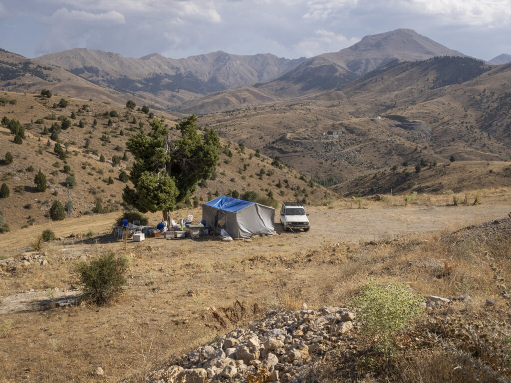 Il terzo giorno mi porta a un altro passo montano e a una lunga discesa fino a Goksun. Prima della città, mi fermo a un benzinaio. L’unica ombra è un gazebo con delle panchine e un tavolo a dondolo. Un signore anziano e un po’ in carne dorme cullato dal suo lento ciondolare. Camioncini antiquati vanno e vengono, carichi di ogni cosa: persone, rami, terra, balle di fieno, attrezzi.